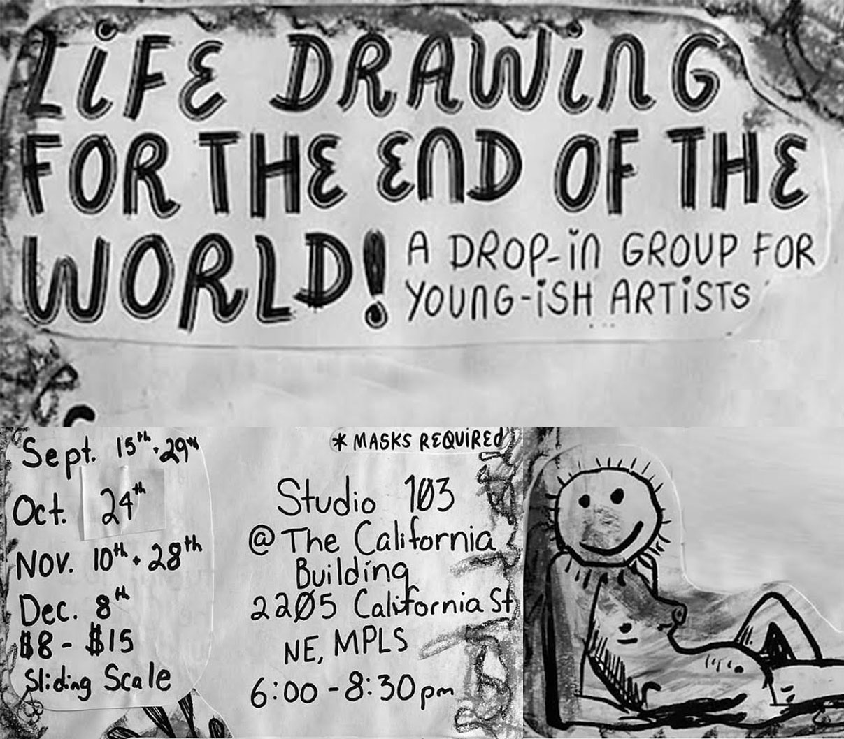Mark your calendars for the upcoming dates of ‘Life Drawing For The End of the World’! This group is an intentional space for younger artists and a safe entry point for models who are trans, disabled, fat, bipoc, or otherwise underrepresented in the figure drawing community! The next session is Fri. Oct. 24th from 6-8:30PM at the California Building, Studio 103. Masks required, all artist levels welcome.