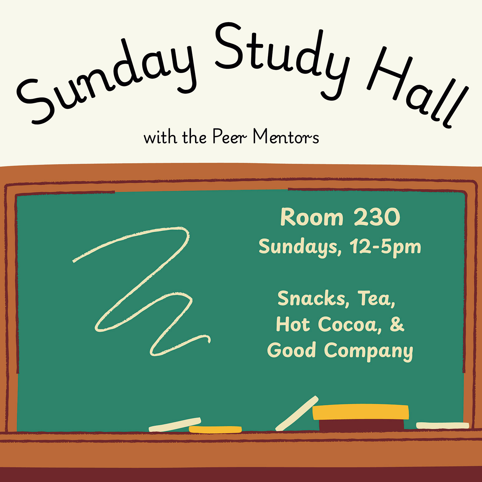 Peer Mentors also host a weekly study hall every Sunday from 12:00-5:00 p.m. in Room 230. All are welcome.