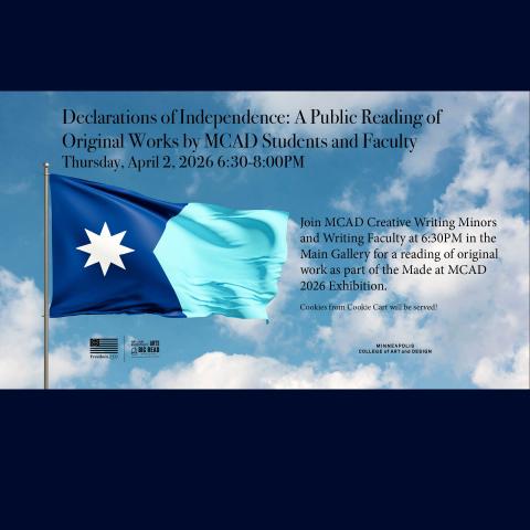Join MCAD Creative Writing Minors and Writing Faculty at 6:30 p.m. in the Main Gallery for a reading of original work as part of the Made at MCAD 2026 Exhibition.